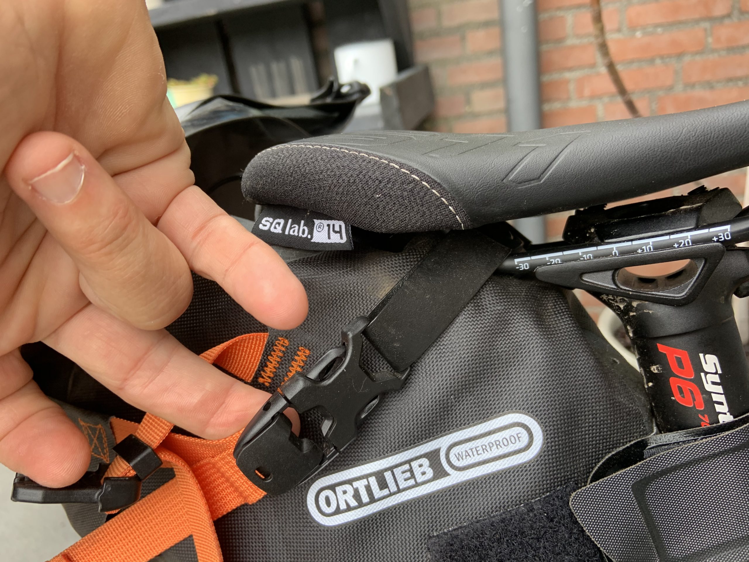 De tas zit dus alleen op je zadelpen en onder je zadel vast.  Aanvankelijk dacht ik dat het wel wiebelig zou zijn als je fietst. Maar niets is minder waar .