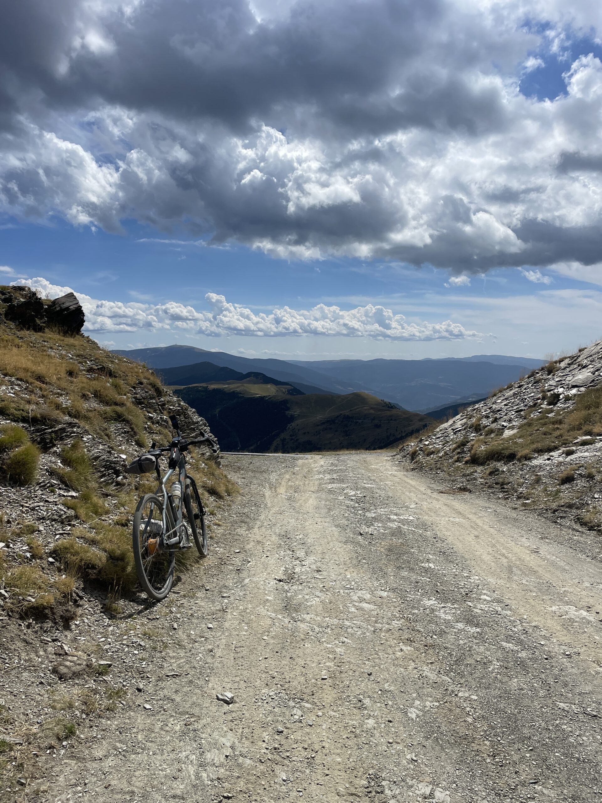Als je dan boven bent en naar de andere kant van de berg kijkt ontvouwd zich daar een fantastisch pad waar je over naar beneden fietst. Echt spectaculair mooi. Je blijft wat op hoogte en daalt wat.