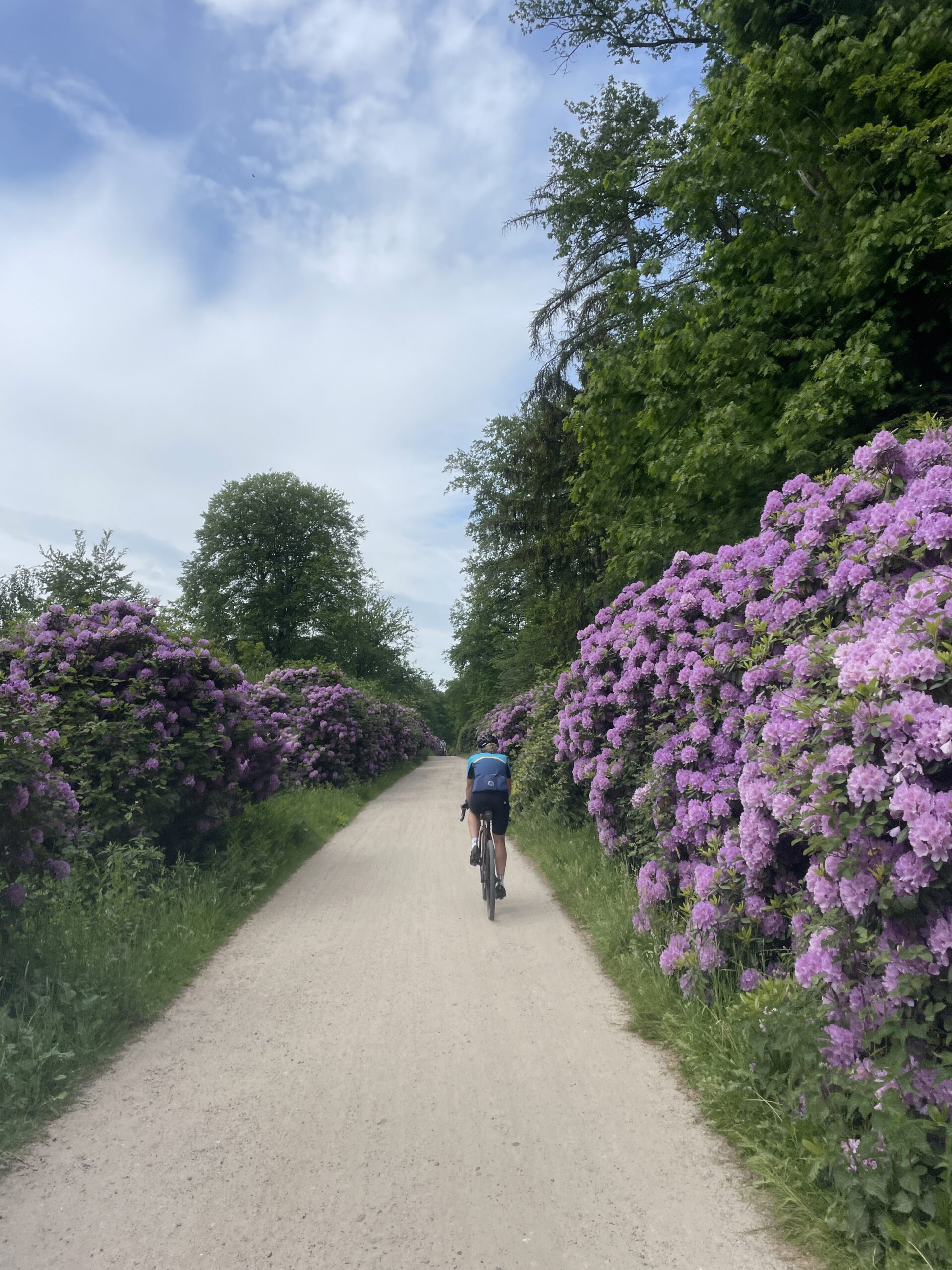 Daar fiets je door de Rhodondenderon straat, die in de bloei periode werkelijk prachtig is!